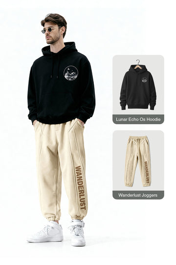 The Midnight Drift Look defines street sophistication through contrast and comfort. The deep black hoodie anchors the outfit, complemented by beige joggers for a refined off-duty palette. Made in soft fleece cotton, it’s built for all-day movement and travel ease. Clean seams, relaxed fit, and a quiet attitude — where Nobero’s modern design meets everyday comfort.