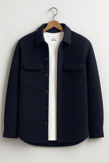 Styling: Complete your winter lookbook by pairing this cozy textured shacket with a trendy Nobero jogger and dainty accessories.